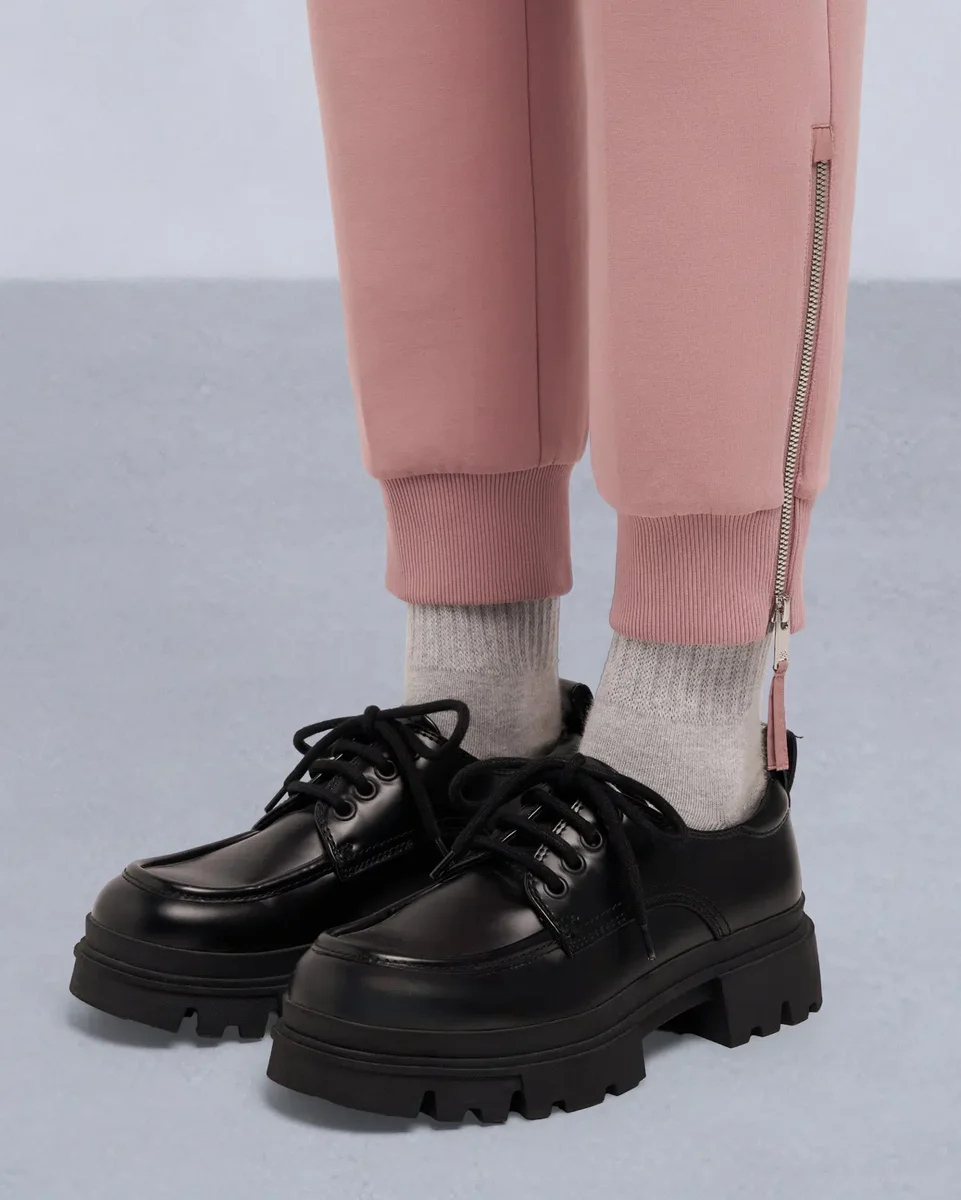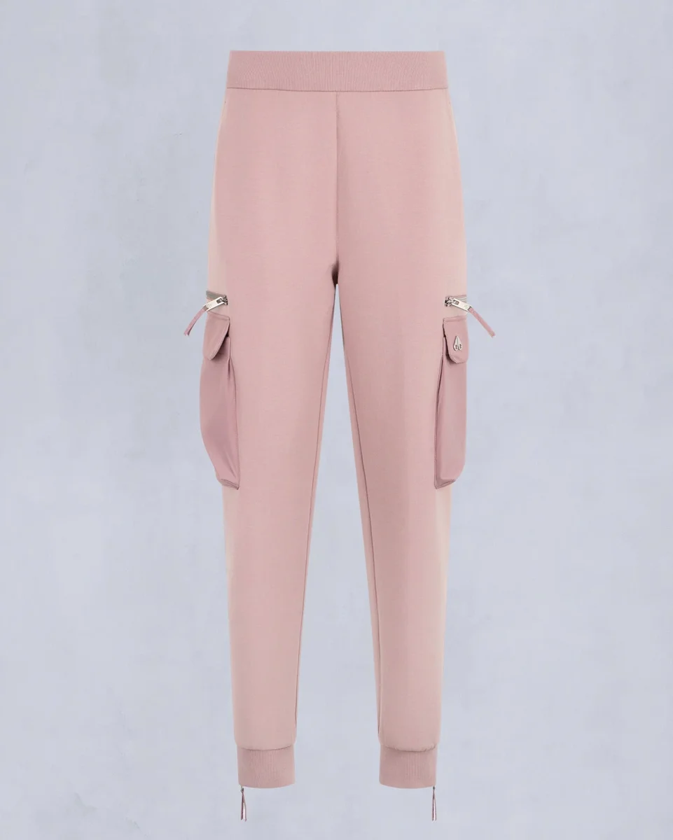 - Ribbstickad midjeresår med dragsko på insidan, ribbstickade muddar och dragkedja vid byxbenet
