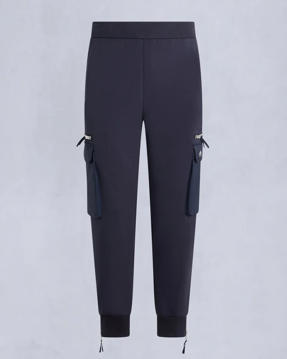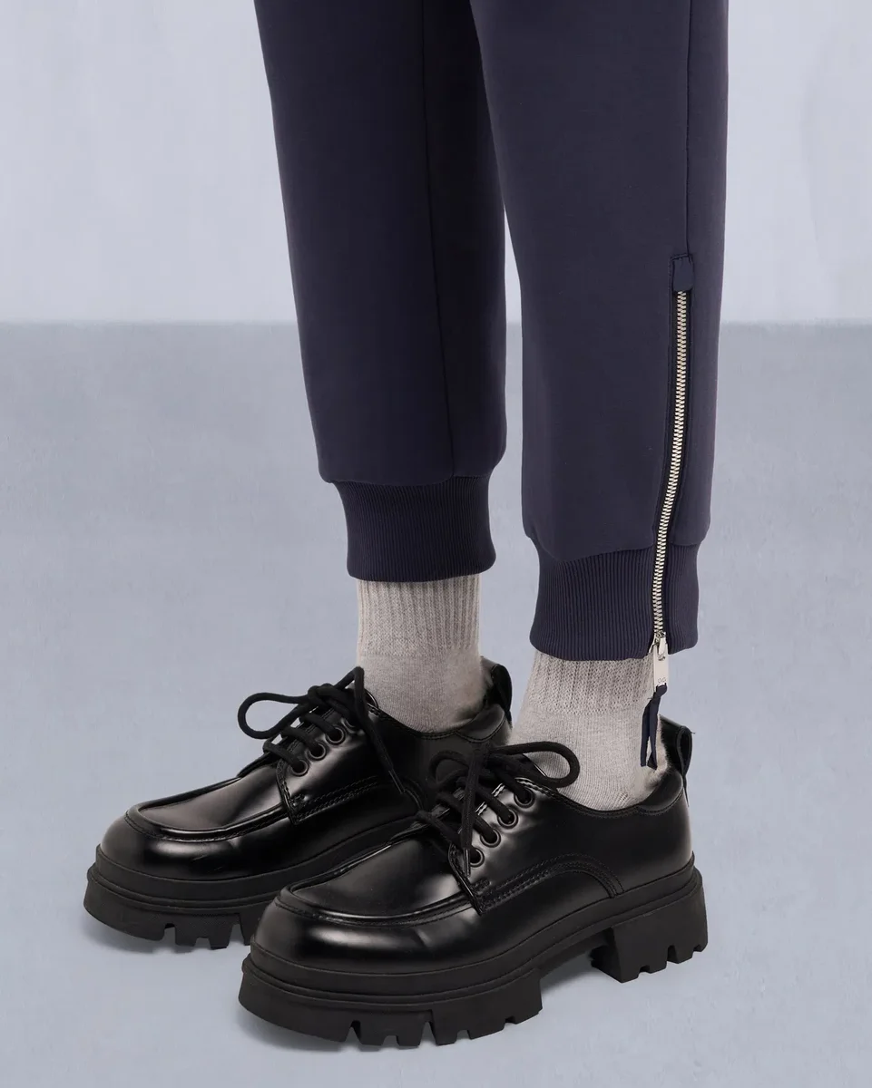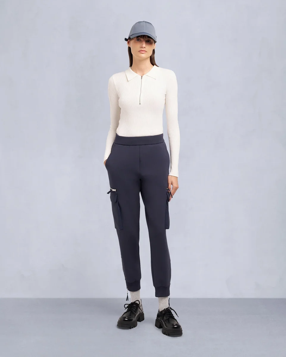 - Ribbstickad midjeresår med dragsko på insidan, ribbstickade muddar och dragkedja vid byxbenet
