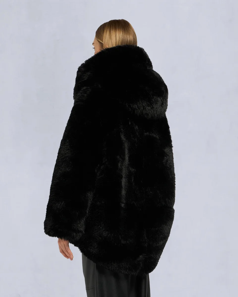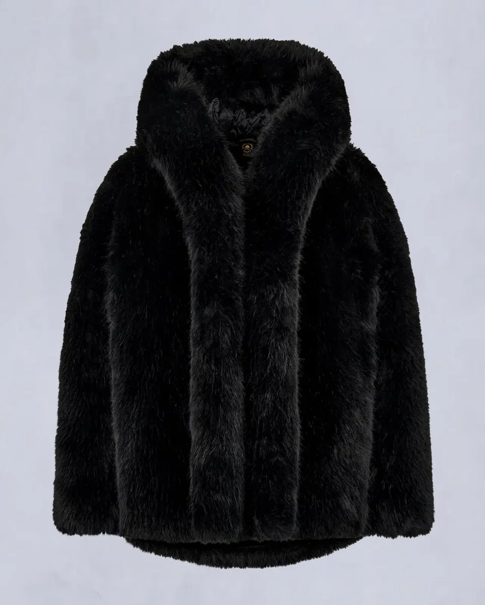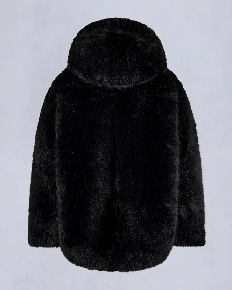 - Fast huva, avtagbara pom-poms i höghårig fuskpäls
