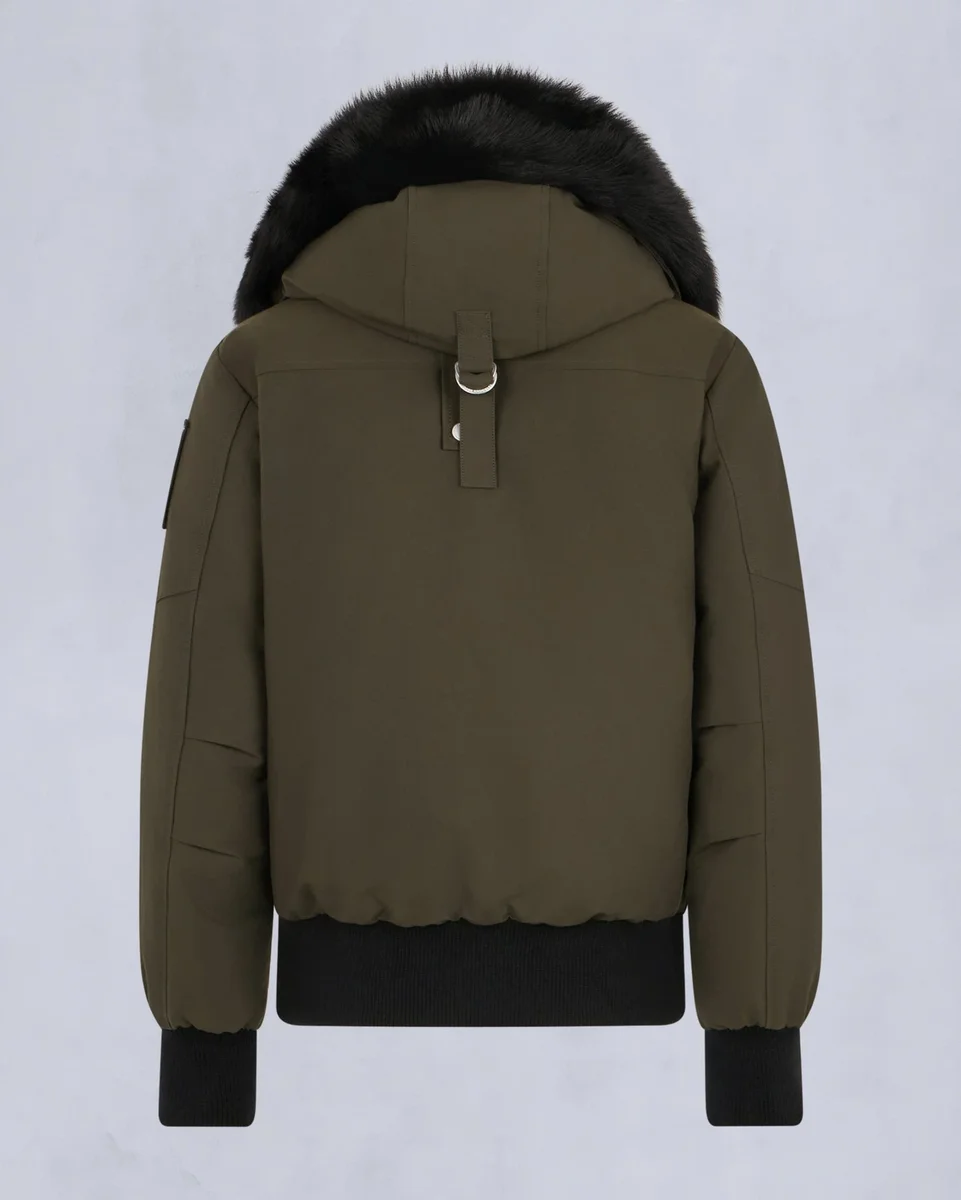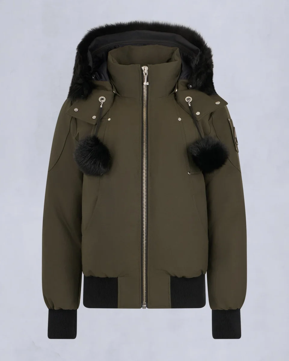 - Avtagbar huva med avtagbar shearlingkant och pom pom-tofsar