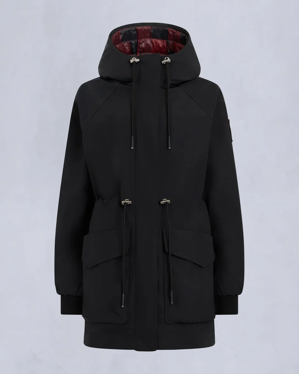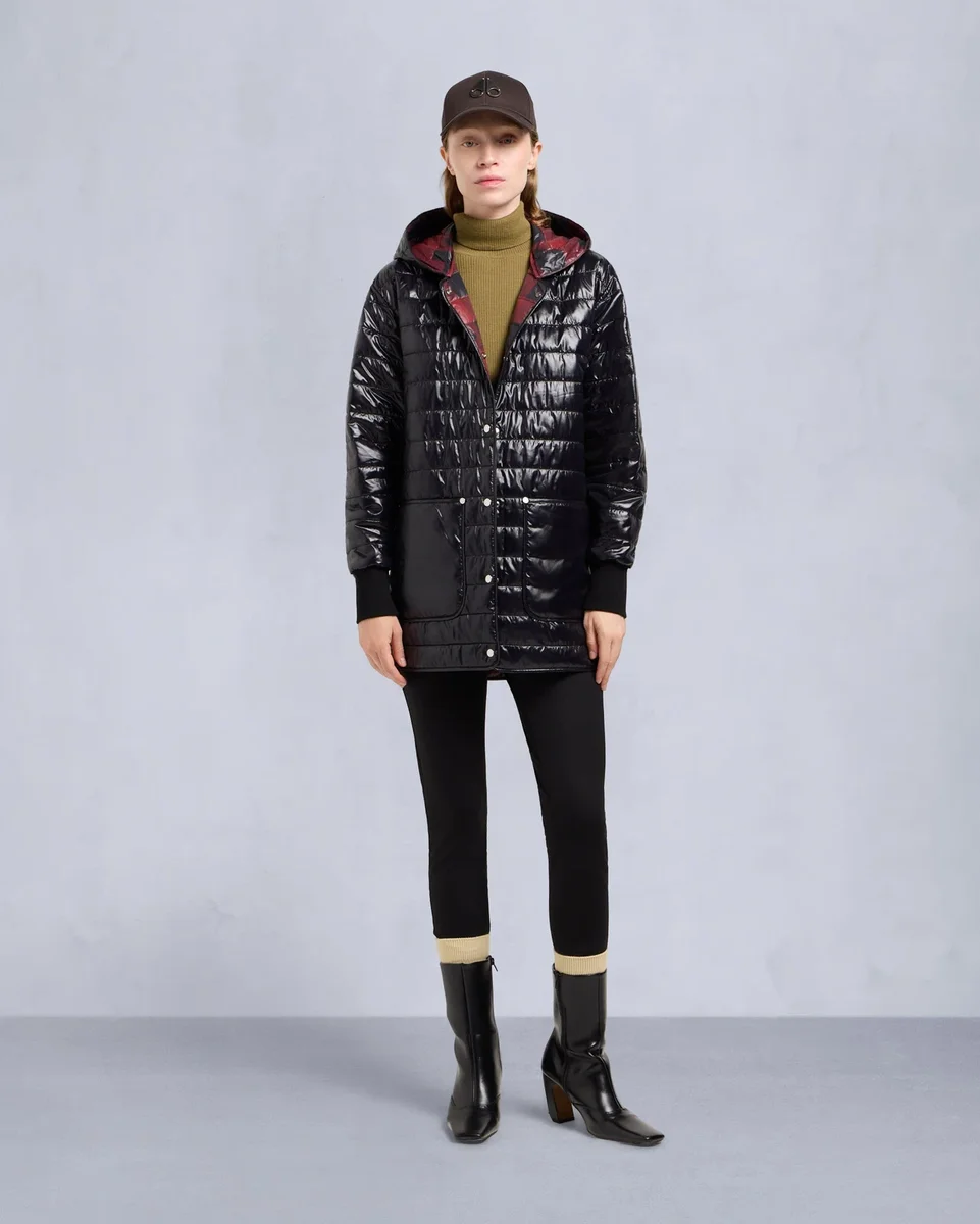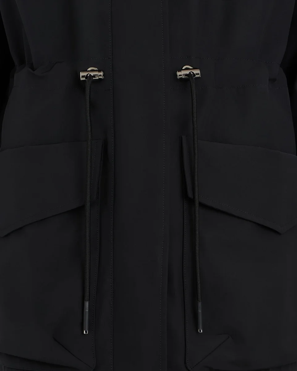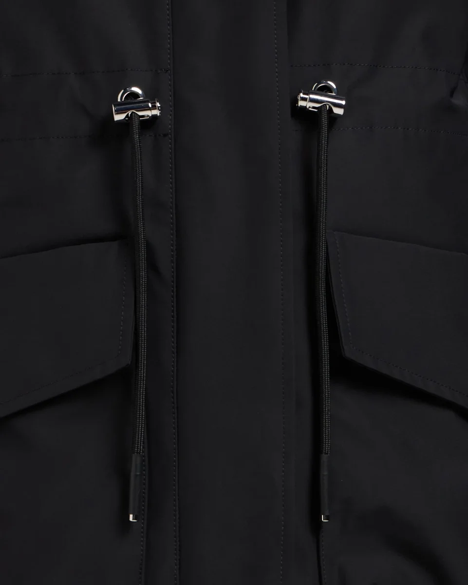 - Yttertyg: 2-vägs dragkedja med knäppning och tryckknappar. Foder: Tryckknappsstängning. Yttertyg: 2 tryckknappsfickor. Foder: 2 påsydda fickor. Rutigt foder på fodret. Litet metallogo.