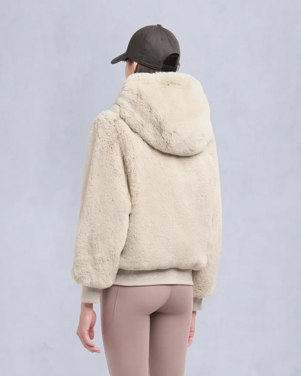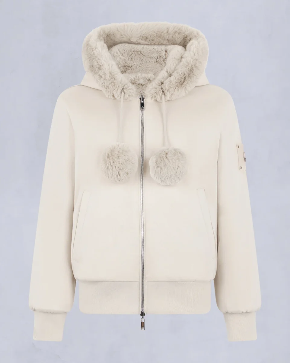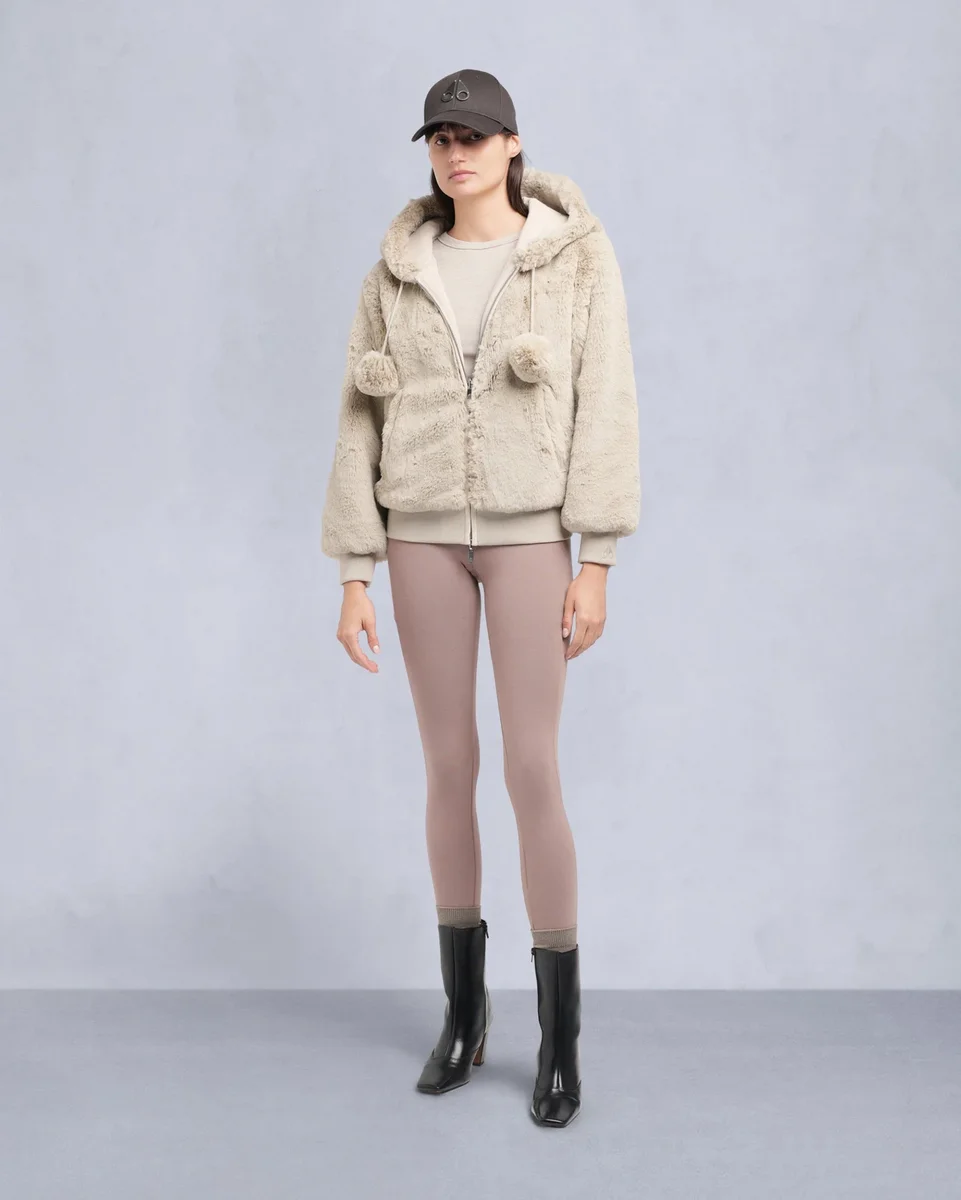 - Huva med avtagbara pompom-detaljer i fuskpäls