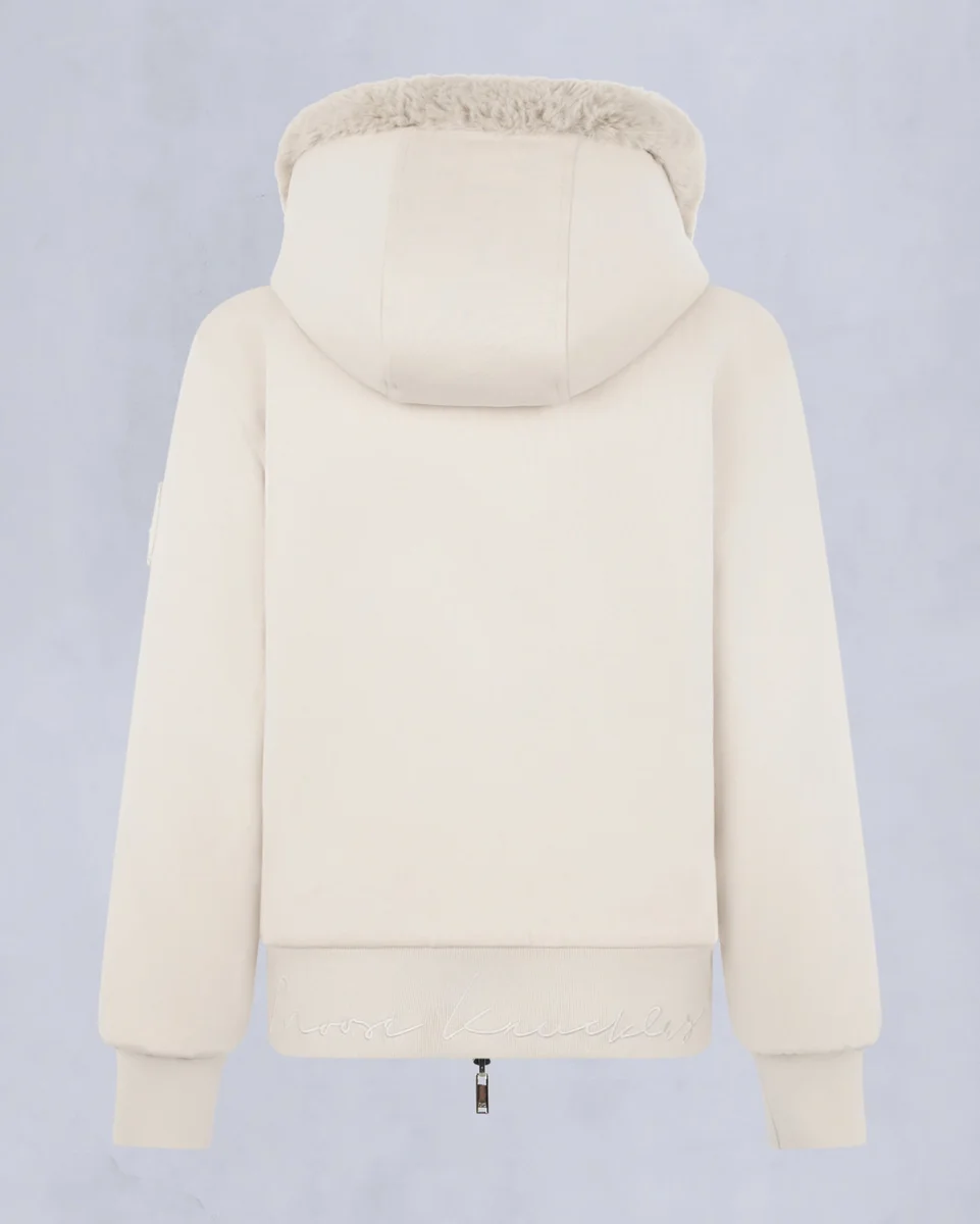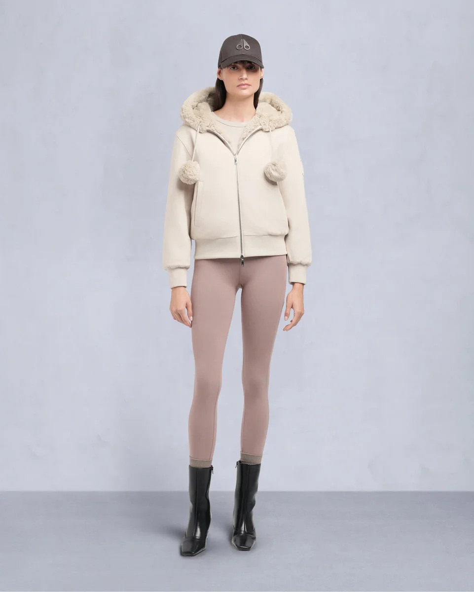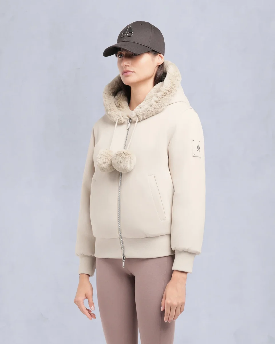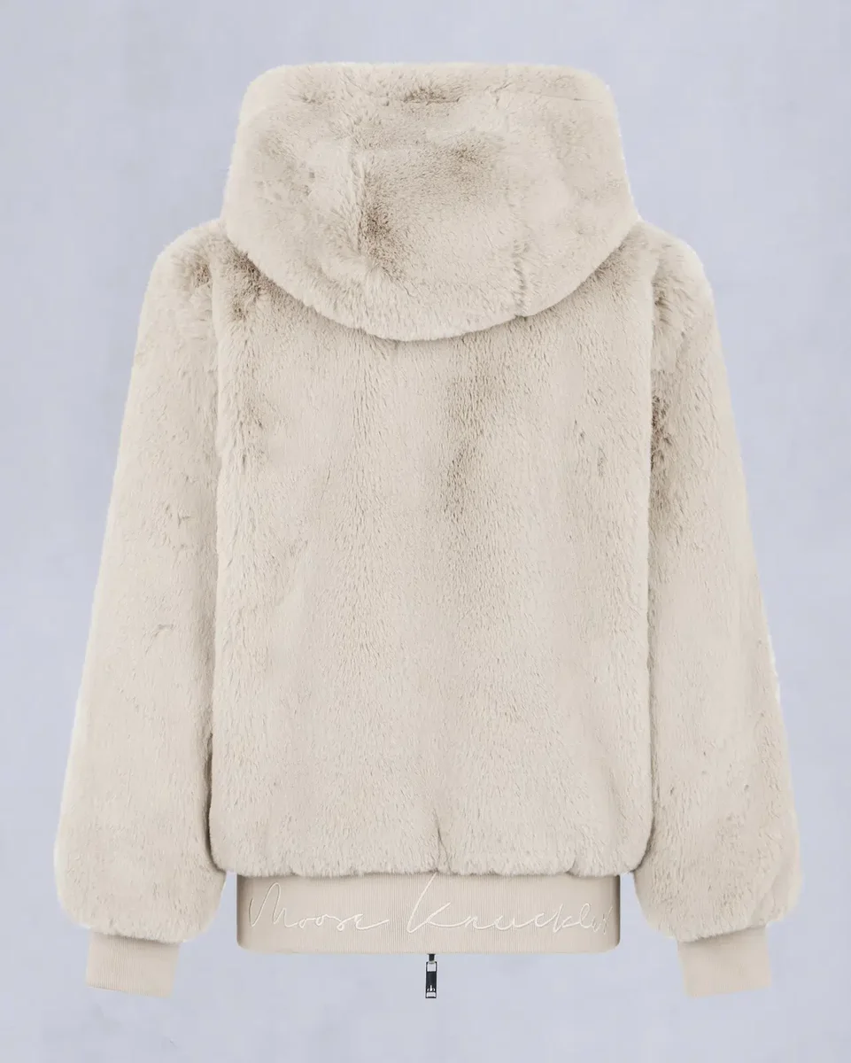 - Huva med avtagbara pompom-detaljer i fuskpäls